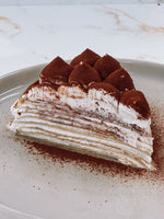 Eenheidsprijs / perEen heerlijke tiramisu pannenkoekentaart met laagjes zachte pannenkoeken, romige mascarponecrème en een subtiele toets van koffie en cacao.